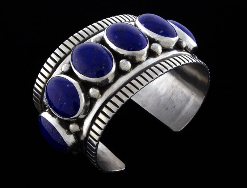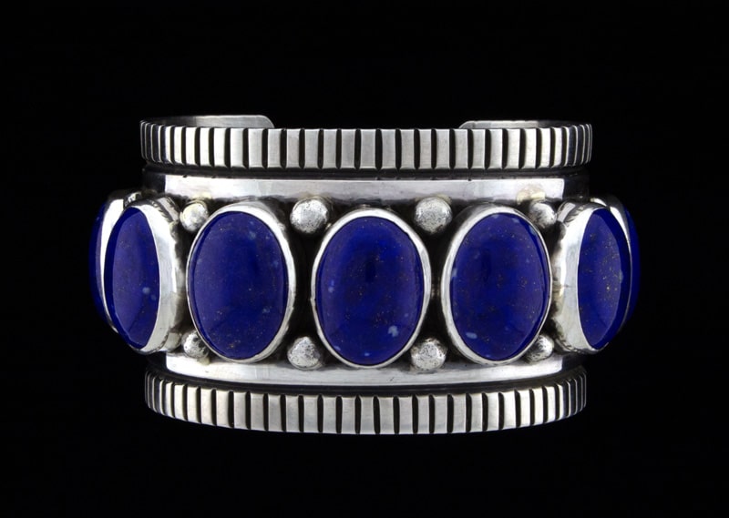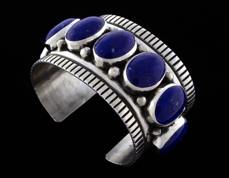 Sterling Silver Bracelet Set With A Prominent Row Of 7 Natural Lapis Stones. Masterfully Handmade By Navajo Artist ALBERT JAKE.