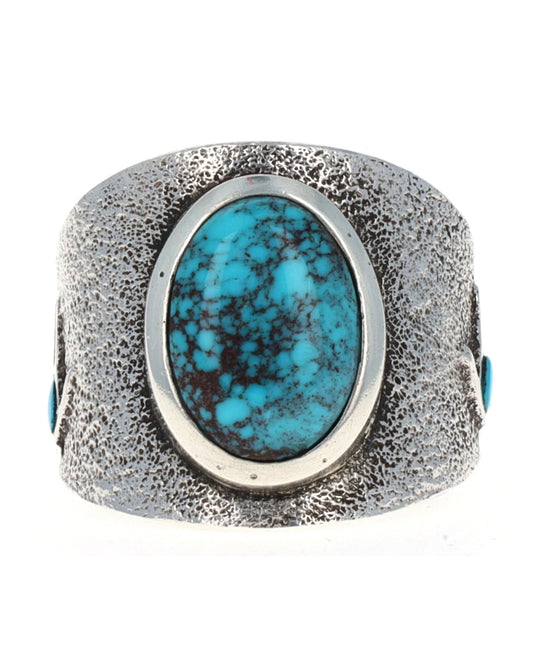 Size 7.25 Tufa Stone Cast Sterling Silver Barn Ring Set With Two Natural Lone Mountain Turquoise Stones, One Set On Hand Symbol In Back Of Ring Band. Masterfully Handmade And Designed By Navajo Artist ROBERT W. BEGAY.