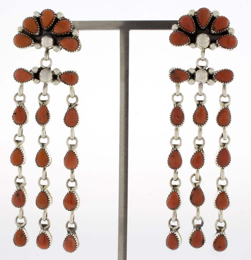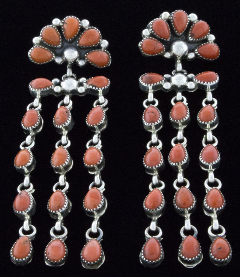 Sterling Silver Chandelier Earrings Each Set With Natural Mediterranean Coral Stones.  Expertly Handmade And Designed By Navajo Artist HUBERT ETSITTY.
