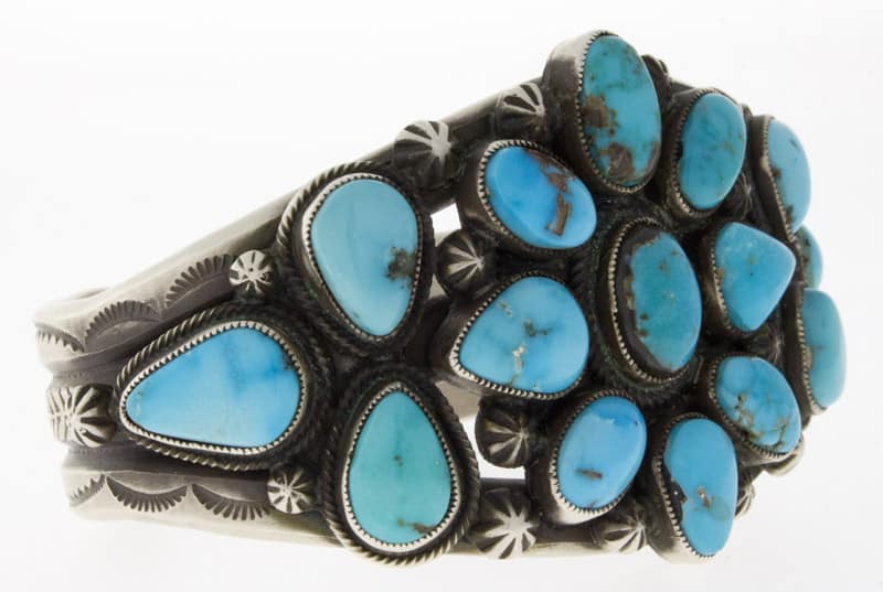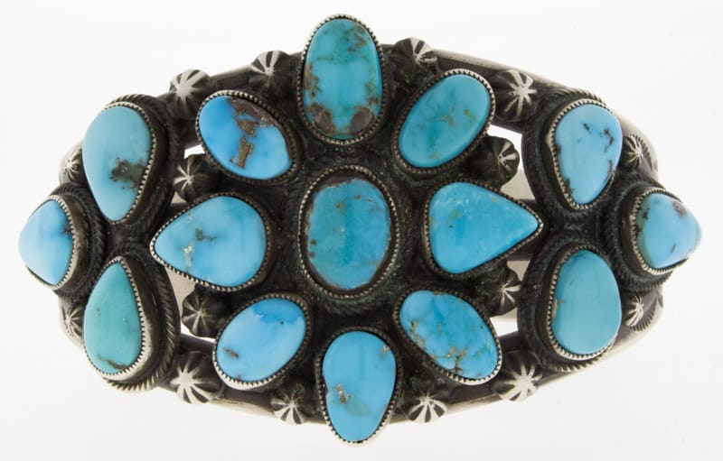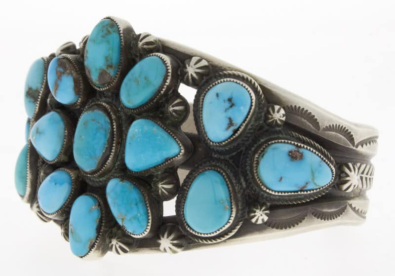Ingot Sterling Silver Bracelet Set With A Cluster Of 15 RARE Natural Morenci Turquoise Stones.  Masterfully Handmade And Designed By Navajo Artist CALVIN MARTINEZ.