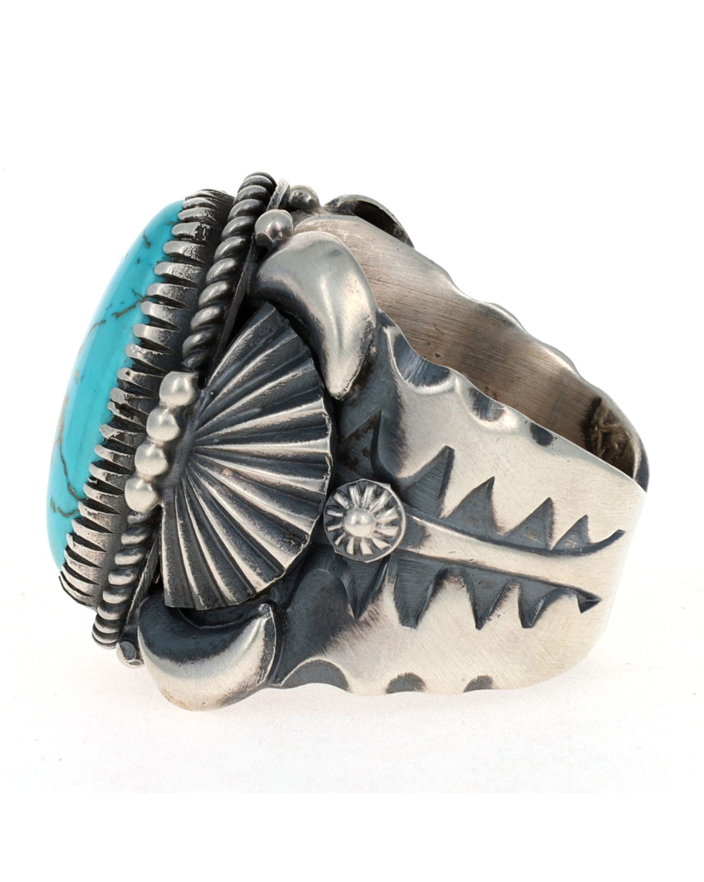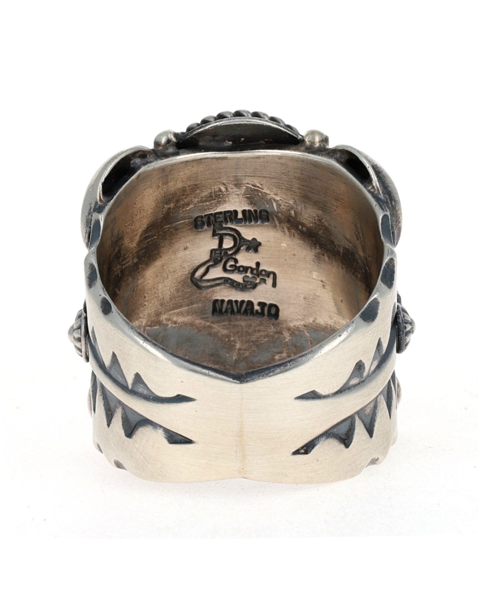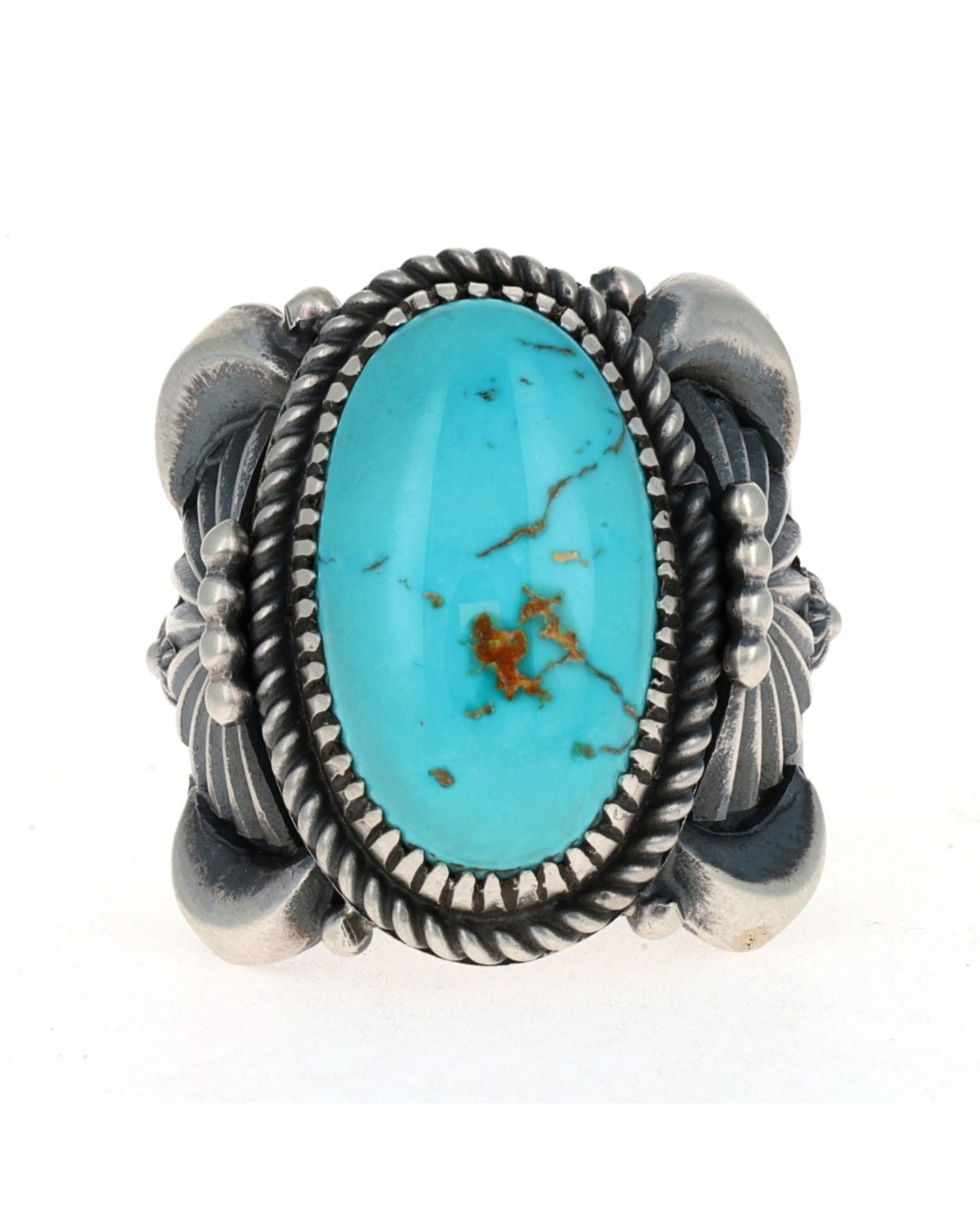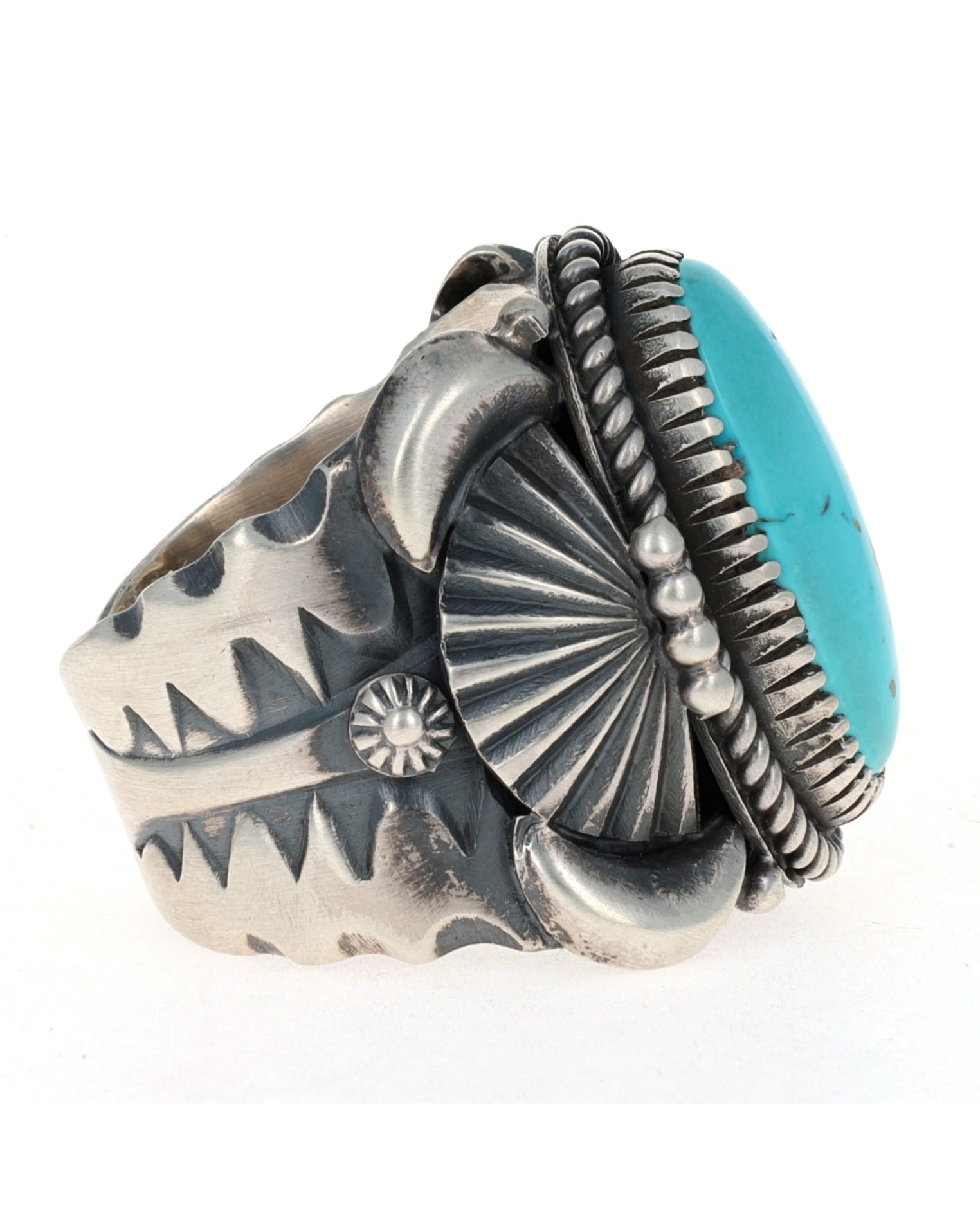 Size 12 "Old Style" Sterling Silver Ring Set With A RARE Long Oval Shaped Natural Morenci Turquoise Stone. Masterfully Handmade And Designed By Navajo Artist DELBERT GORDON.
