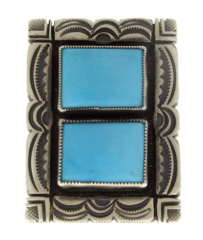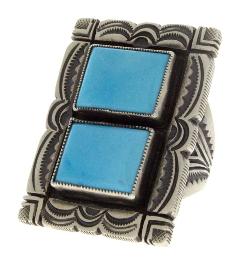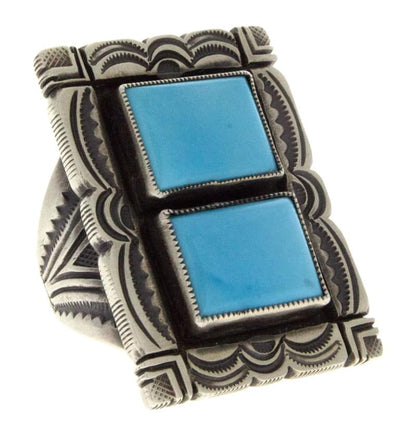 Size 10.5 Heavy Gauge "Old Style" Ingot Sterling Silver Shadowbox Ring Design Set With Two RARE Natural Sleeping Beauty Turquoise Stones.  Masterfully Handmade And Designed By Navajo Artist CALVIN MARTINEZ.
