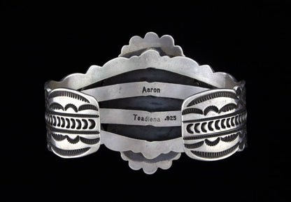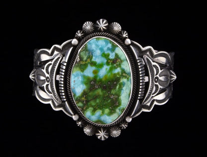 "Old Style" Sterling Silver Bracelet Set With An Impressive Oval Shaped Natural Sonoran Gold Turquoise Stone. Masterfully Handmade By Navajo Artist AARON TOADLENA.