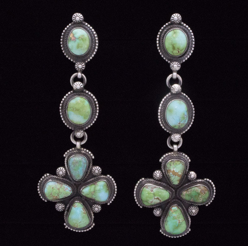 "Old Style" Ingot Sterling Silver Double-Dangle Fat Cross Earrings Each Set With 6 Natural Sonoran Gold Turquoise Stones.  Masterfully Handmade And Designed By Navajo Artist CALVIN MARTINEZ.