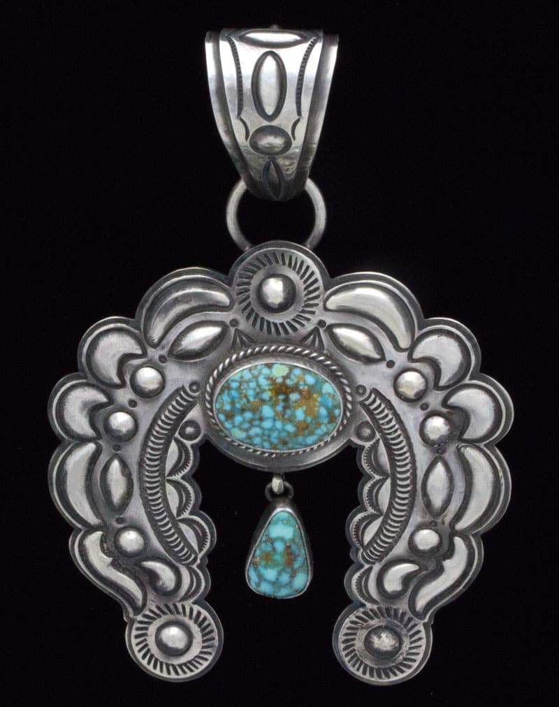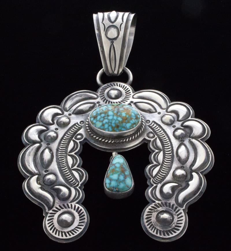 "Old Style" Sterling Silver Naja Pendant Set With Two Natural Turquoise Mountain Turquoise Stones.  Masterfully Handmade And Designed By Navajo Artist ROLAND DIXSON.