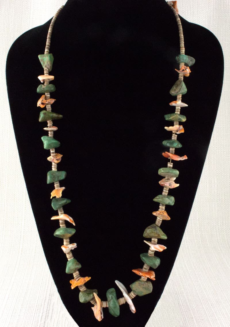 • Materials/Technique: Hand Polished, Polished & Strung Nevada Green Turquoise Free-Form Nuggets; Hand Drilled, Cut, Polished And Strung Lion's Paw Shell Tabs; Hand Cut, Drilled, Ground, Polished And Strung Olive Shell Heishi; Native Neck Wrap