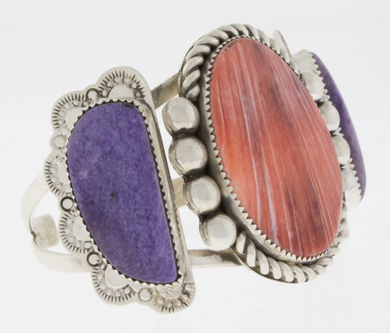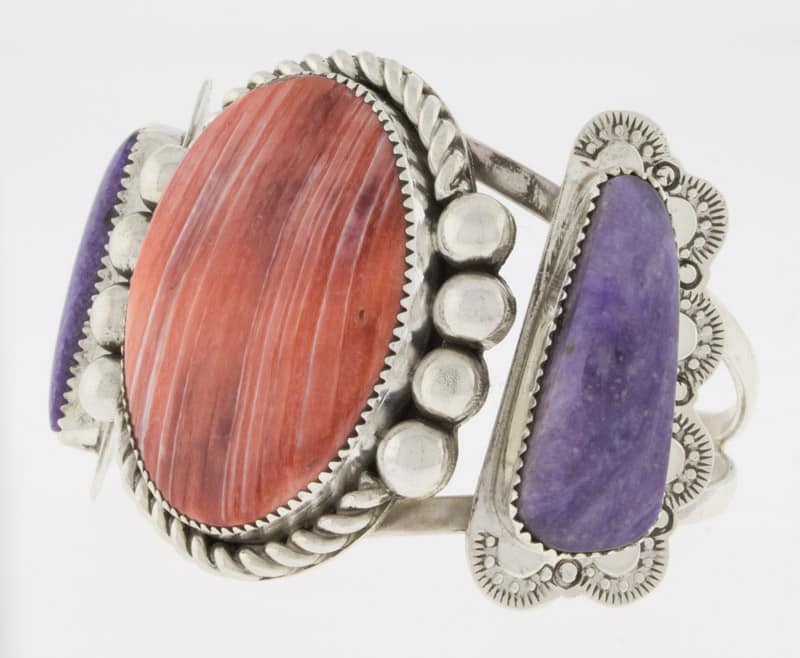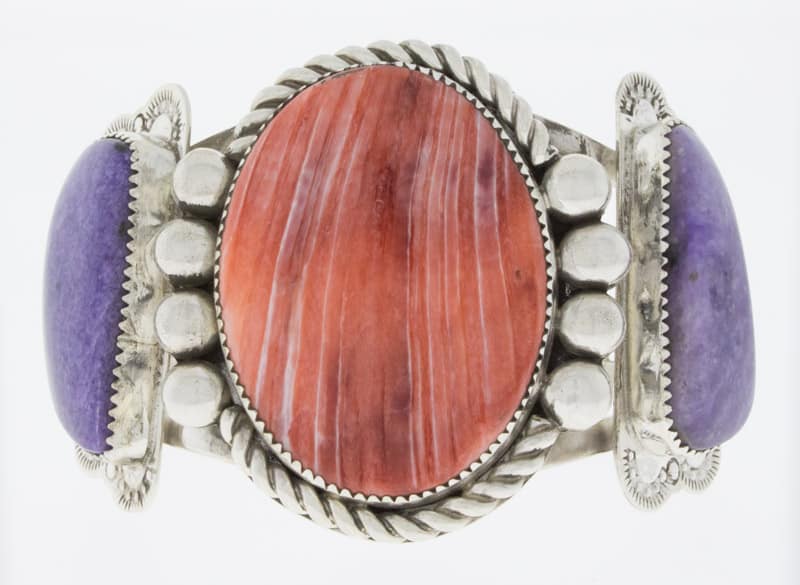 Sterling Silver Bracelet Set With A Red Spiny Oyster Center Stone And 2 Charoite Side Stones.  Masterfully Handmade And Designed By Santo Domingo Pueblo Artist DANIEL CORIZ.