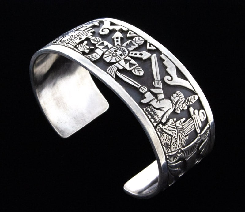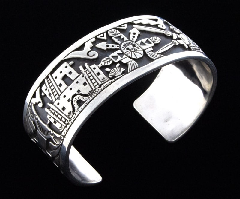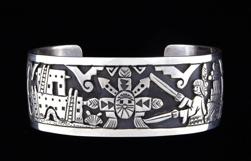 Sterling Silver Overlay Storyteller Bracelet Masterfully Handmade And Designed By Navajo Artist FREDDY CHARLIE.