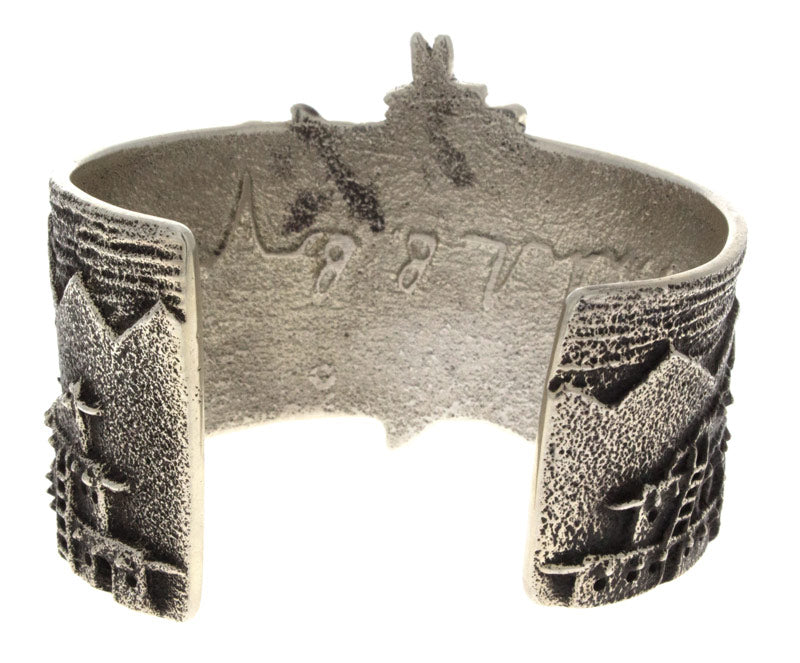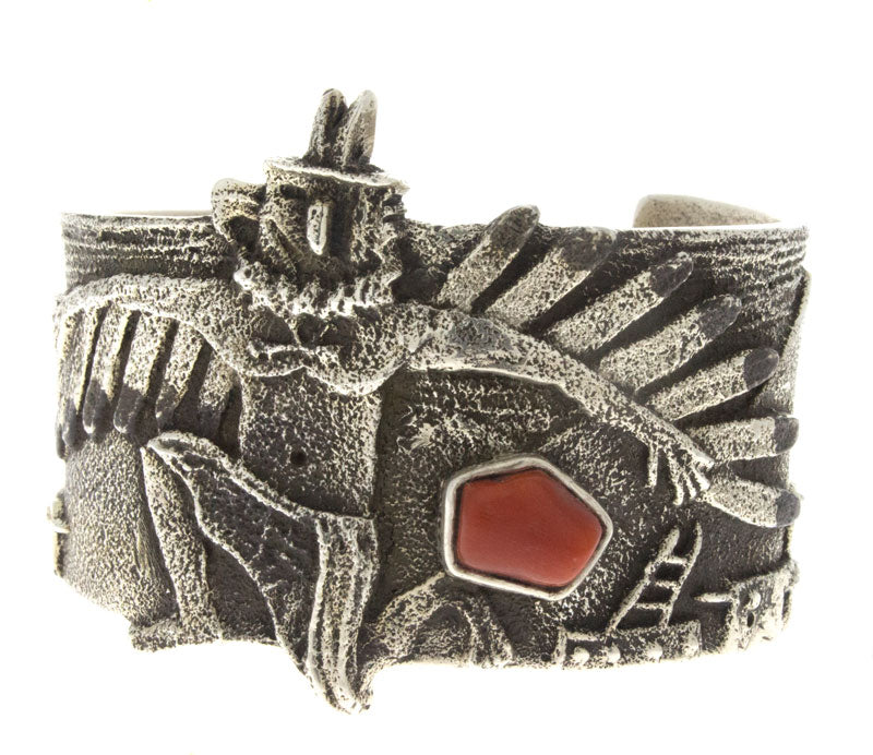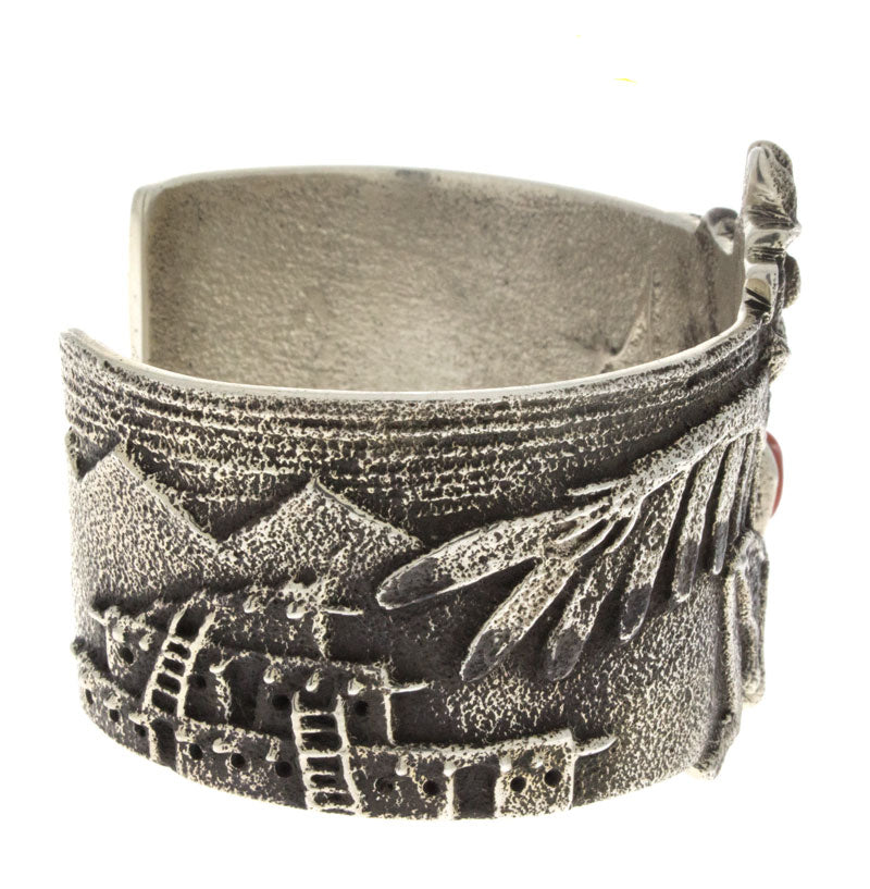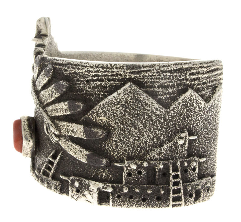 Tufa Stone Cast Sterling Silver Bracelet Depicting A Native American Eagle Dancer With Pueblo Scene.  Set With A Natural Mediterranean Coral Stone.  Masterfully Handmade And Designed By Navajo Artist PHILANDER BEGAY.