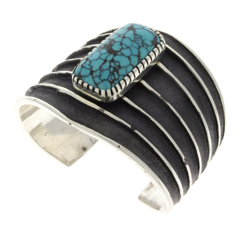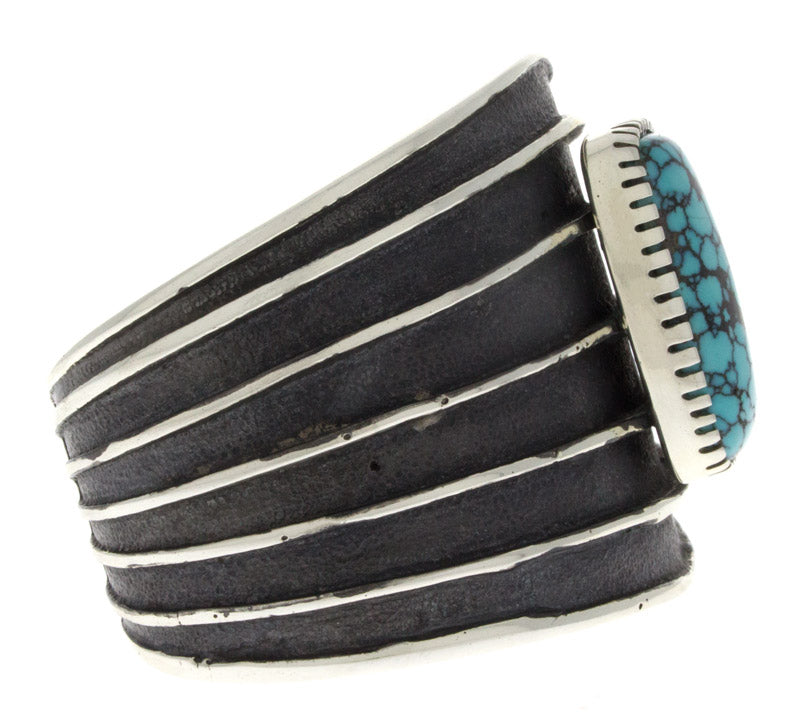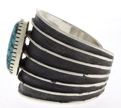 Tufa Stone Cast Sterling Silver Bracelet Set With A High Grade Natural Cloud Mountain Turquoise Stone. Masterfully Handmade And Designed By Navajo Artist PHILANDER BEGAY.