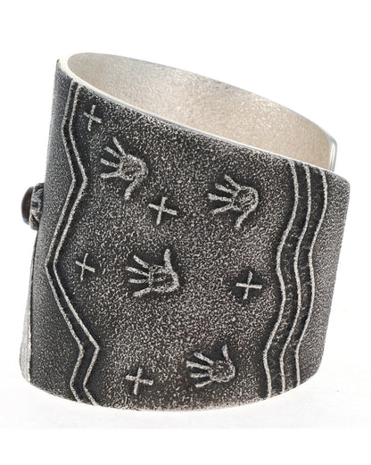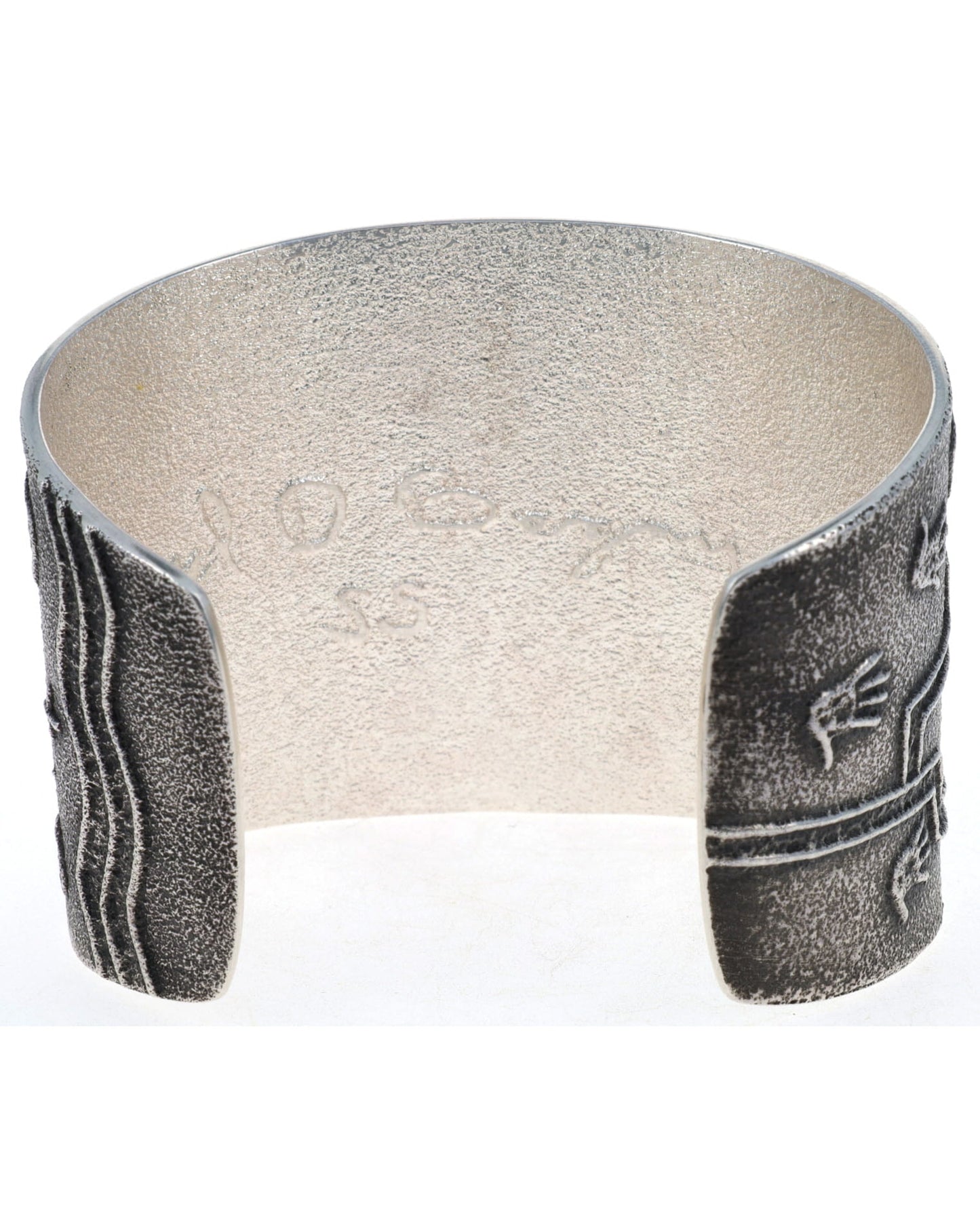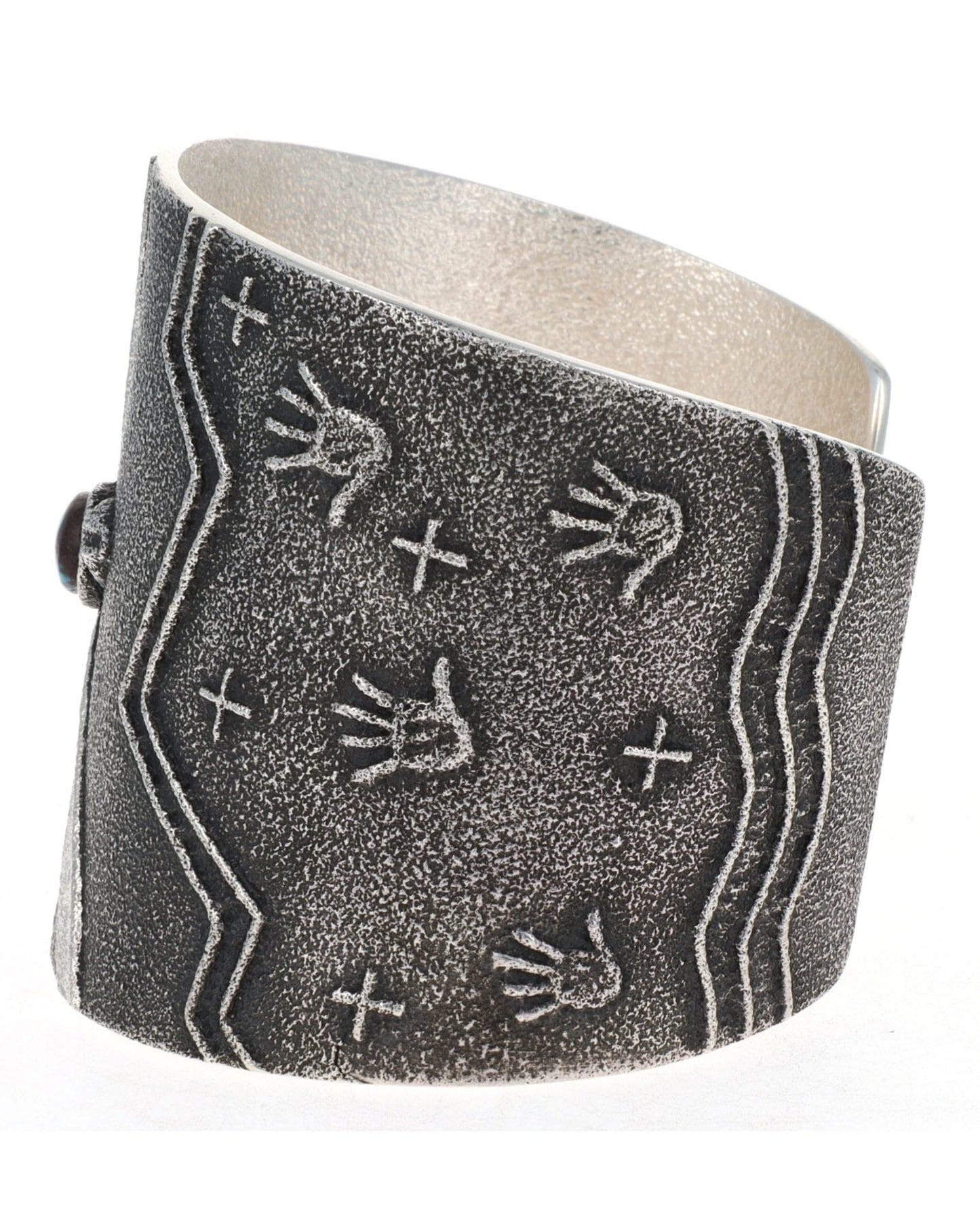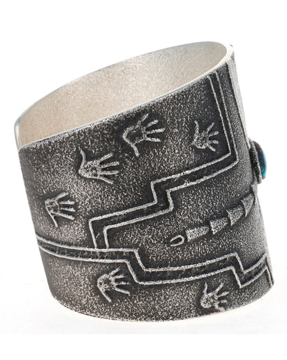 Hand Carved Tufa Stone Cast Sterling Silver Dragonfly Bracelet With Petroglyph Hand Prints And Set With A High Grade Natural Bisbee Turquoise Stone.  Masterfully Handmade And Designed By Navajo Artist DARRYL DEAN BEGAY.