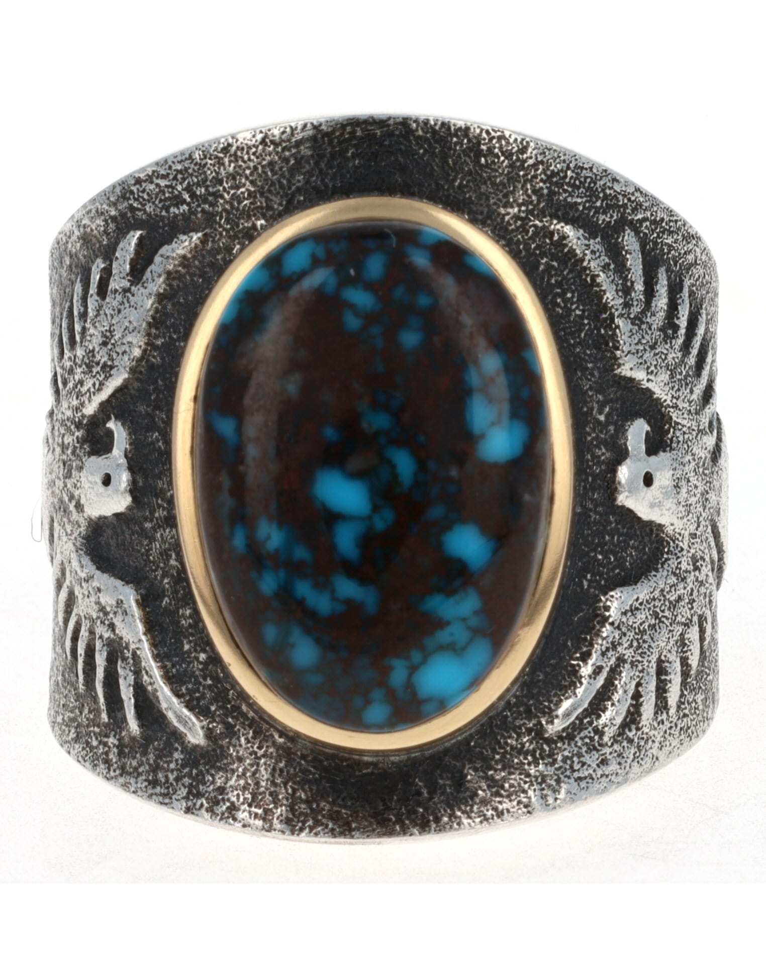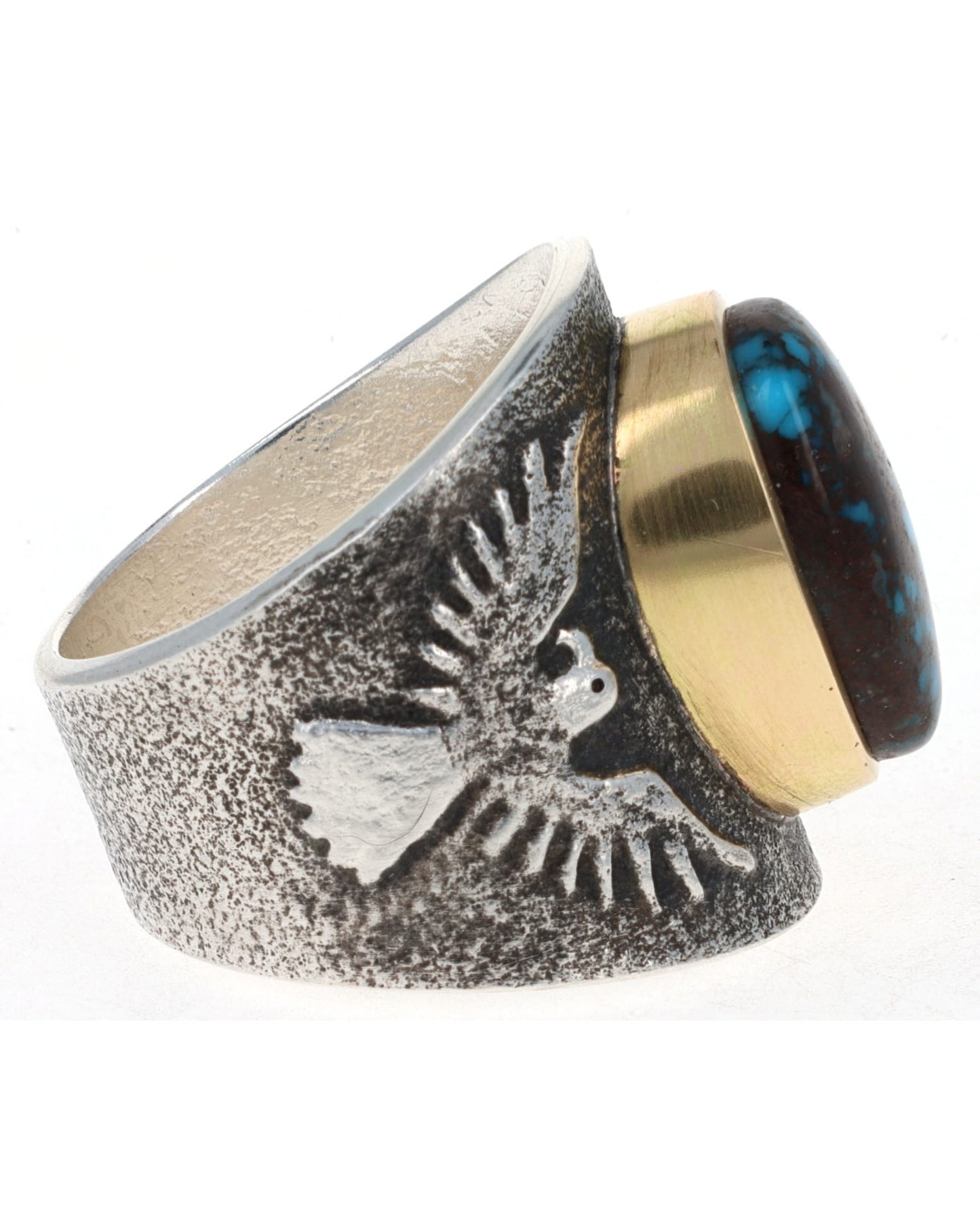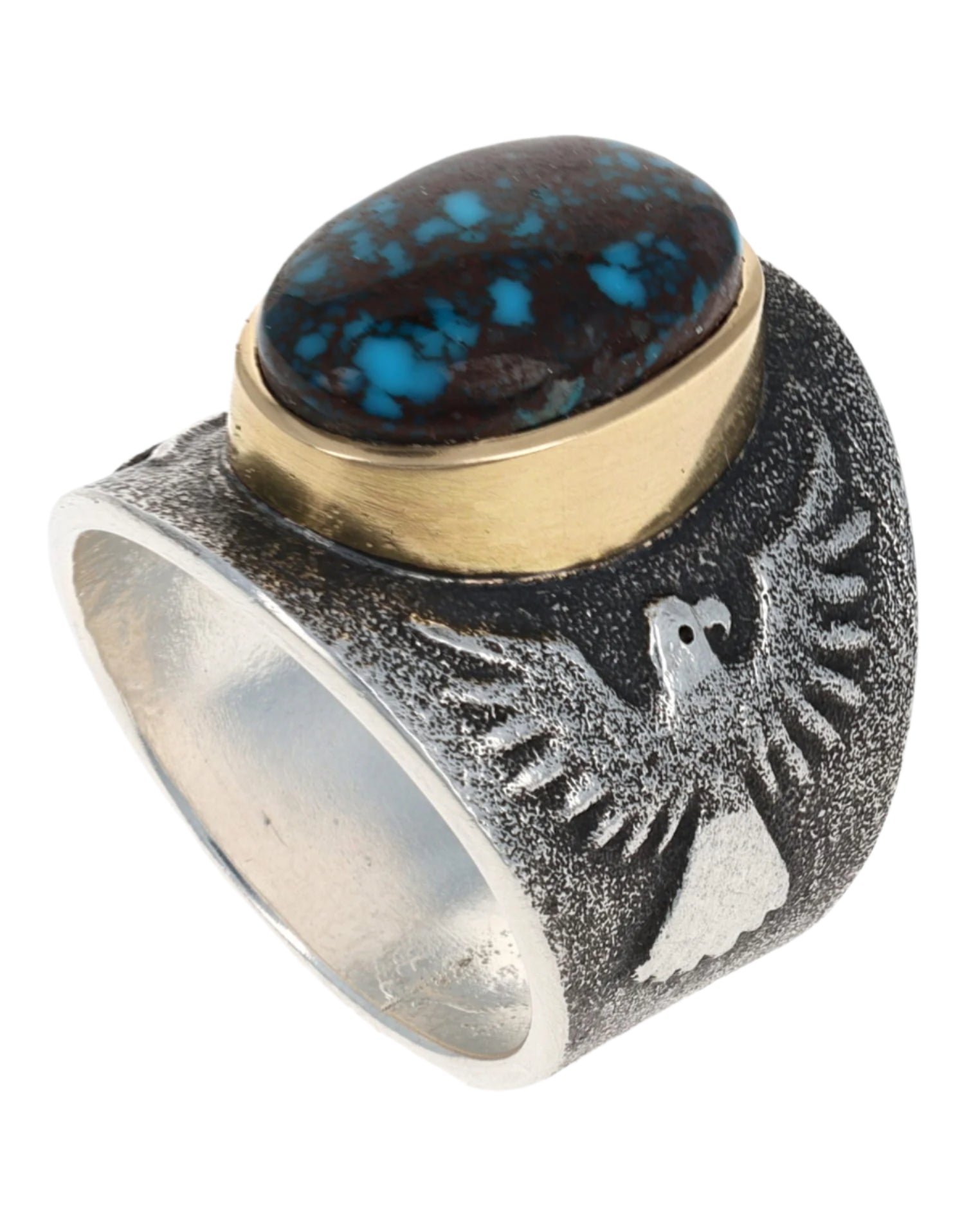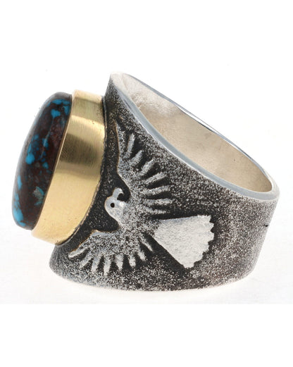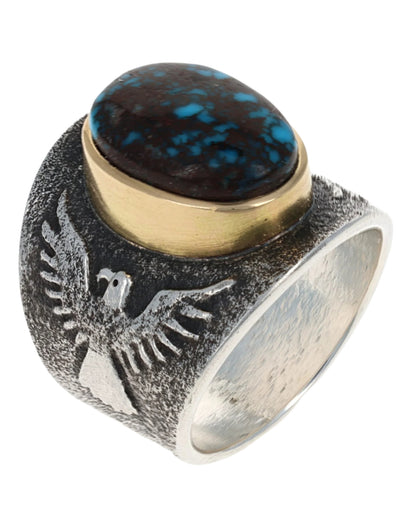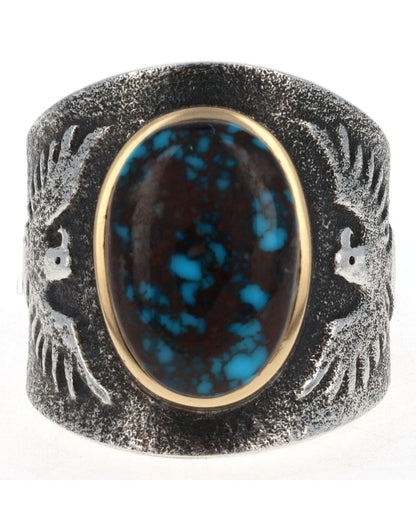 Size 12.5 Tufa Cast Sterling Silver Thunderbird Ring Set With A High Grade Natural Bisbee Turquoise Stone Secured In An 18k Gold Bezel.  Masterfully Handmade And Designed By Navajo Artist DARRYL DEAN BEGAY.