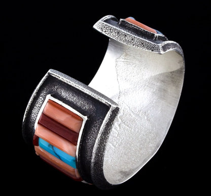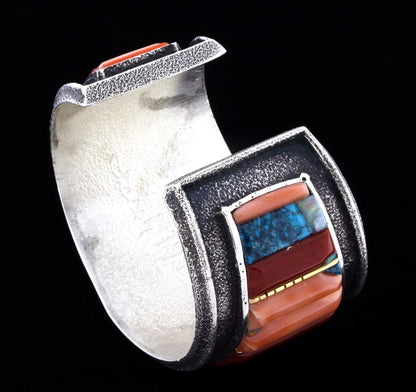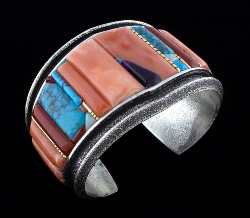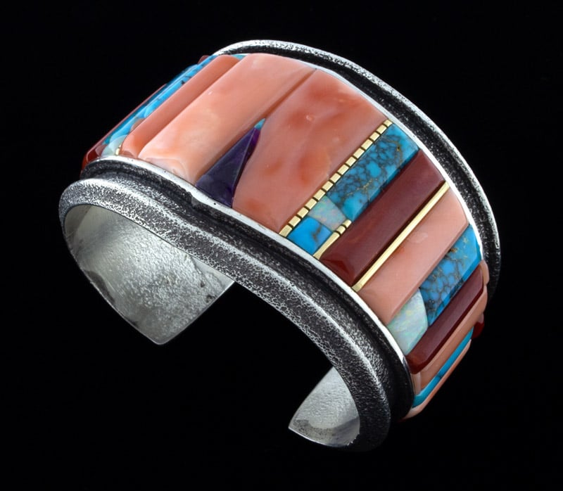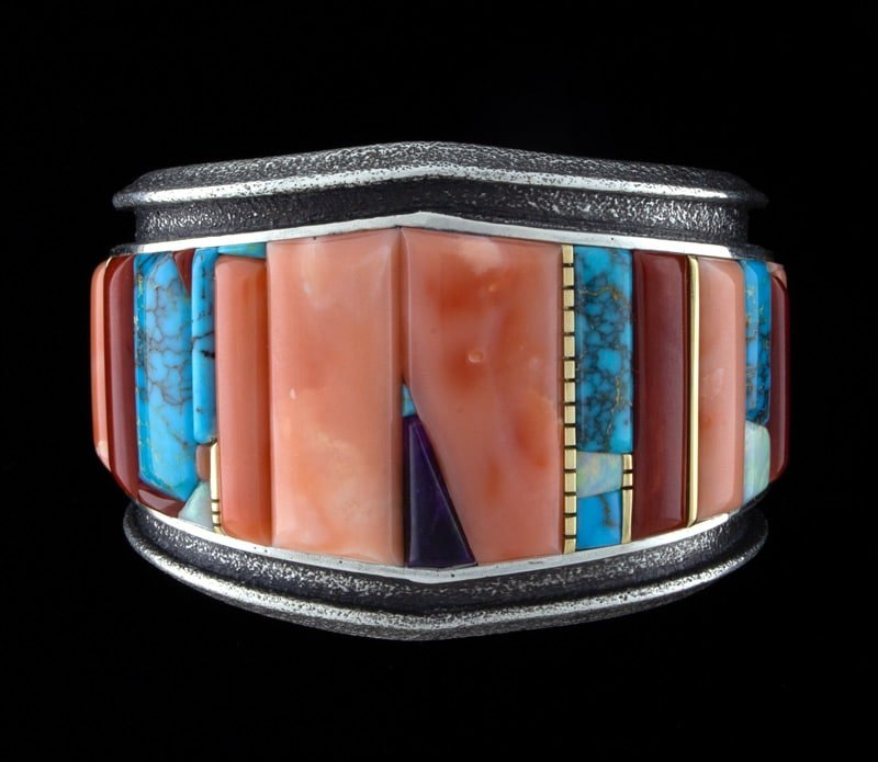 Tufa Stone Cast Heavy Gauge Sterling Silver Bracelet With 18k Gold Spacers In A Raised Cobblestone Inlay Design Of High Grade Natural Stones Consisting Of Mediterranean Coral, Salmon Coral, Angel Skin Coral, Lone Mountain Turquoise, Sugilite And Australian Opal.  Masterfully Handmade And Designed By Navajo Artist ISIAH M. BEGAY.