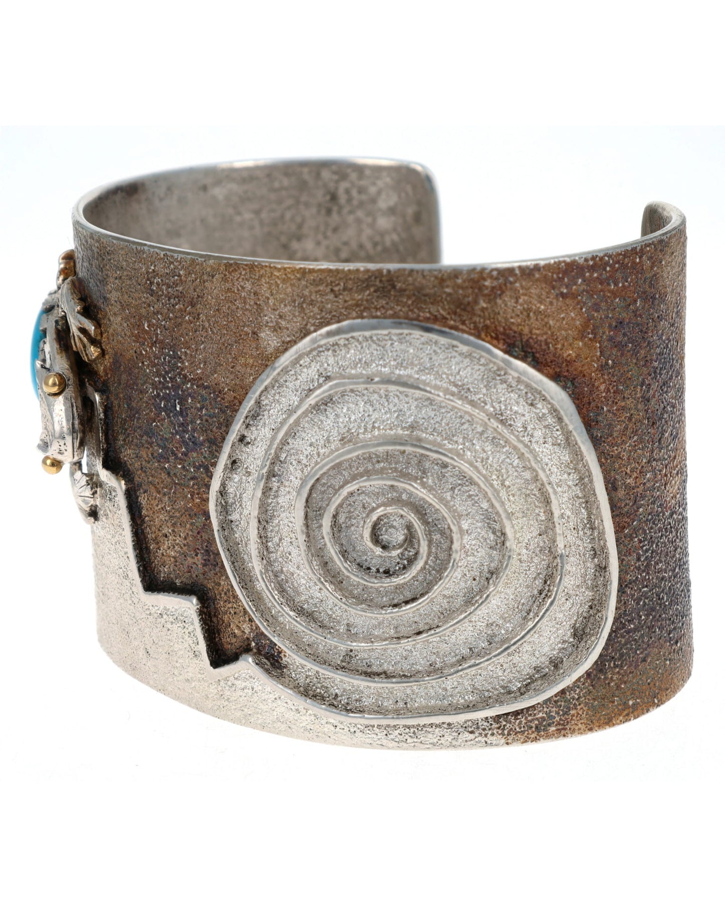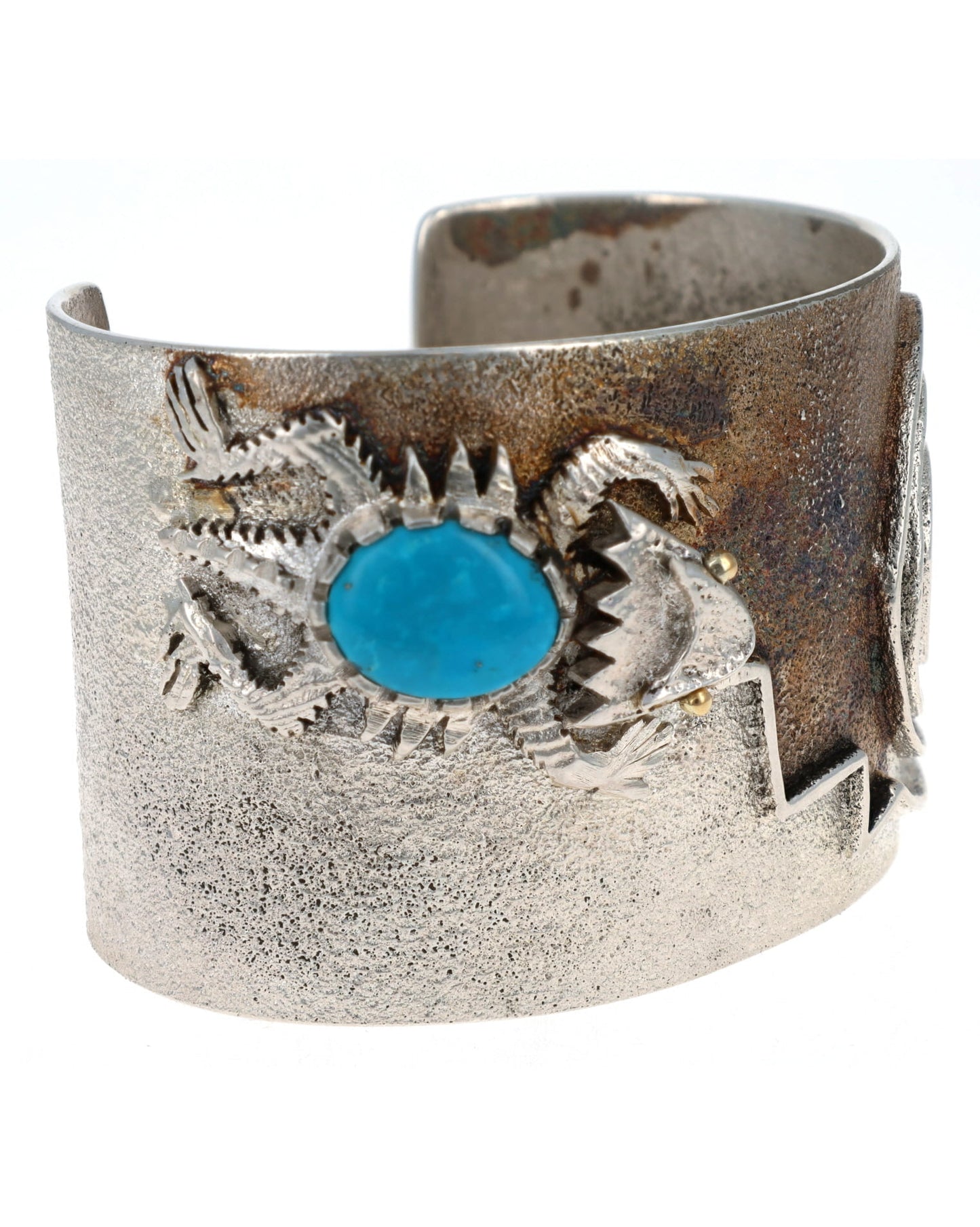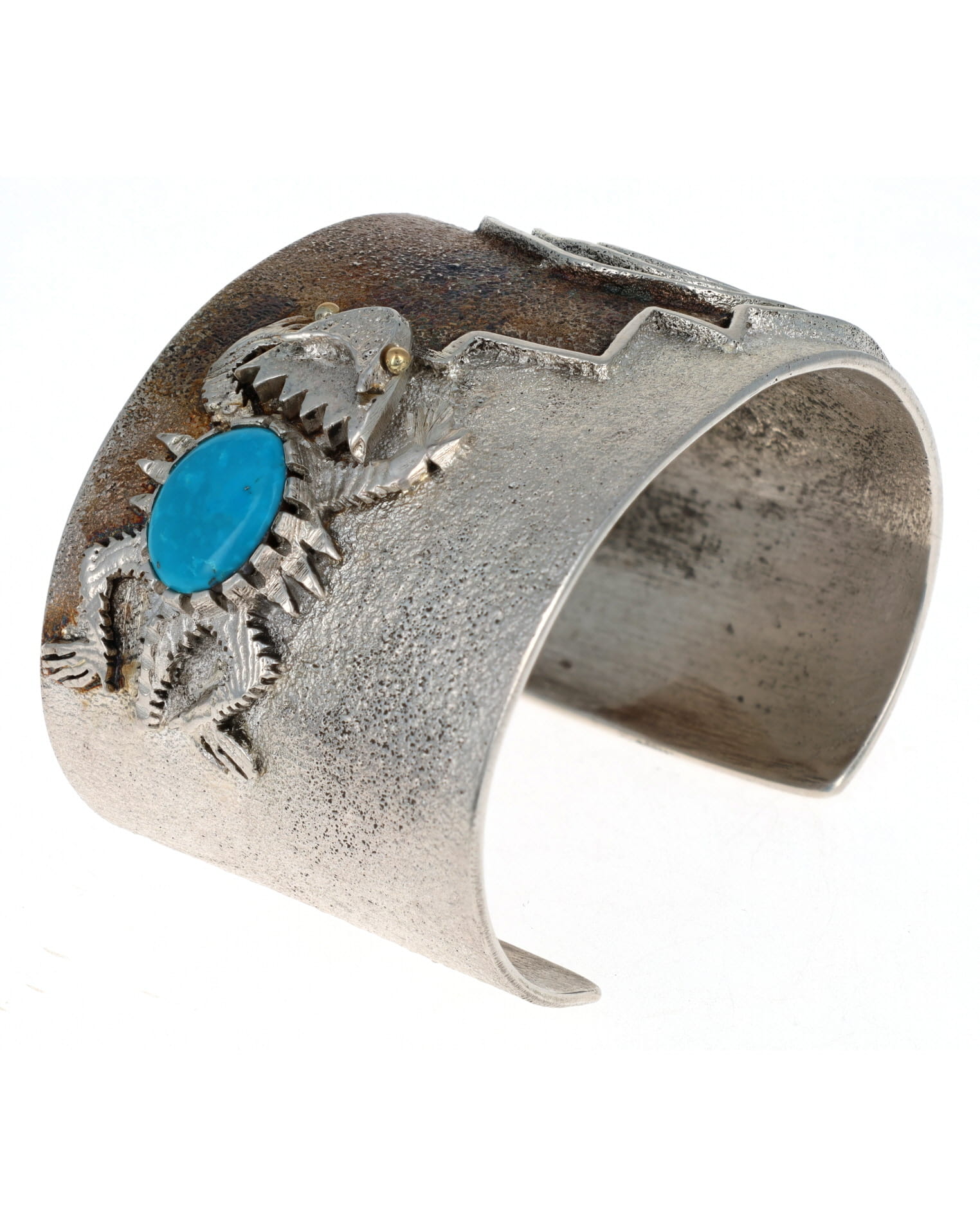 Tufa Stone Cast Sterling Silver Horny Toad Bracelet With 18k Gold Eyes And Set With A RARE Natural Morenci Turquoise Stone. Masterfully Handmade And Designed By Navajo Artist PHILANDER BEGAY.