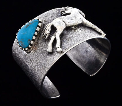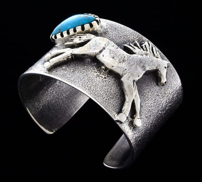 Tufa Stone Cast Sterling Silver Hand Carved Horse Bracelet Set With A Natural Nevada Blue Turquoise Stone.  Masterfully Handmade And Designed By Navajo Artist PHILANDER BEGAY.