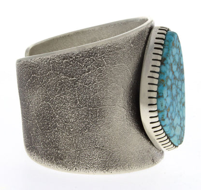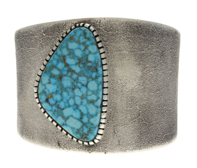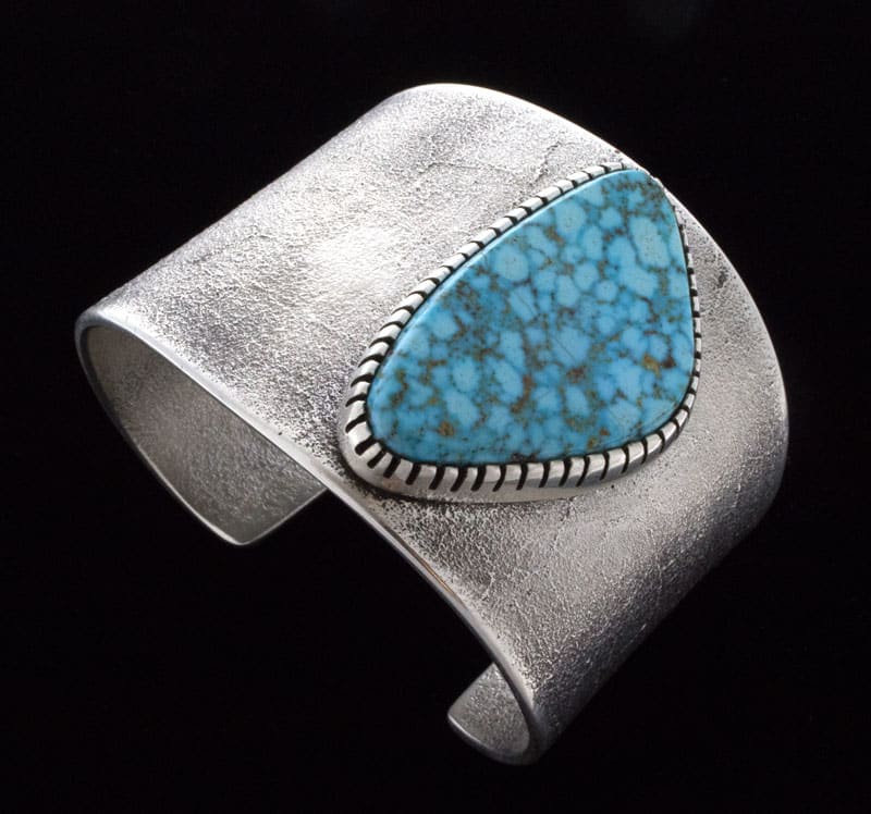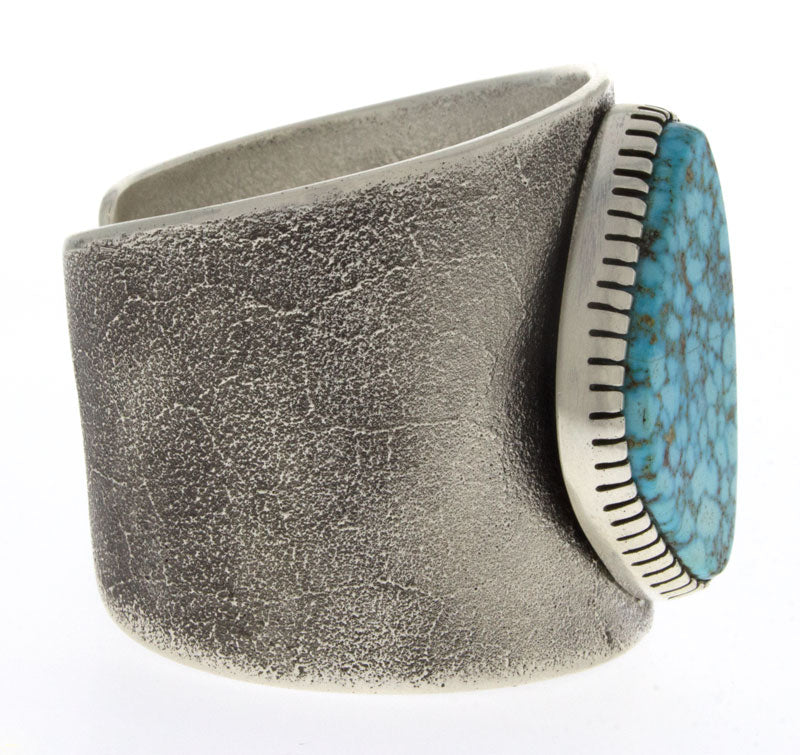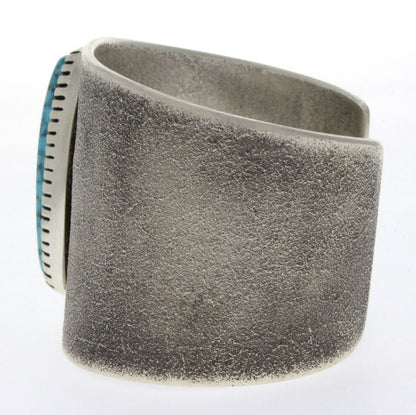 Tufa Stone Cast Sterling Silver Bracelet Set With An Impressive 39 Carat Natural Kingman Turquoise Stone.  Masterfully Handmade And Designed By Navajo Artist PHILANDER BEGAY.