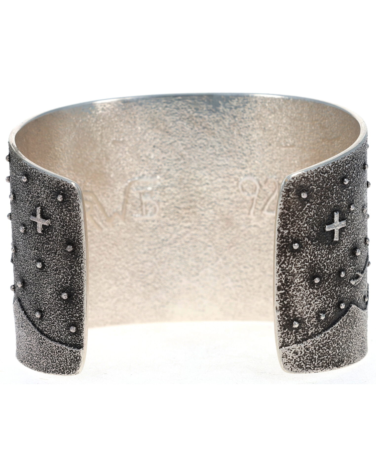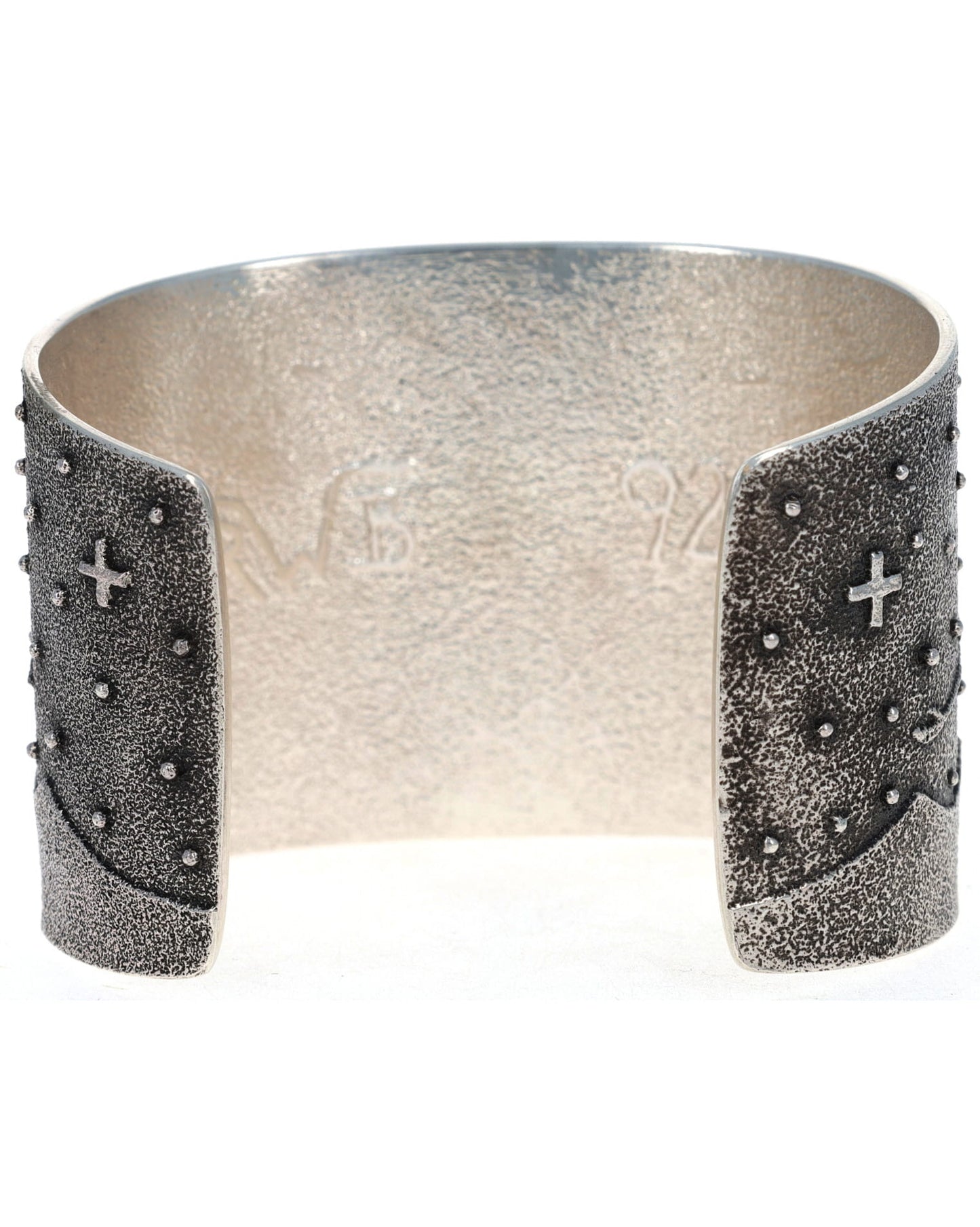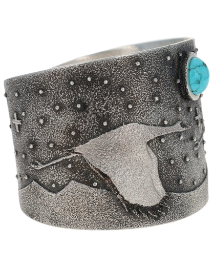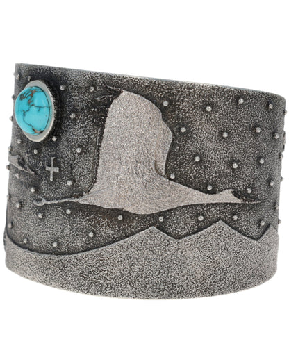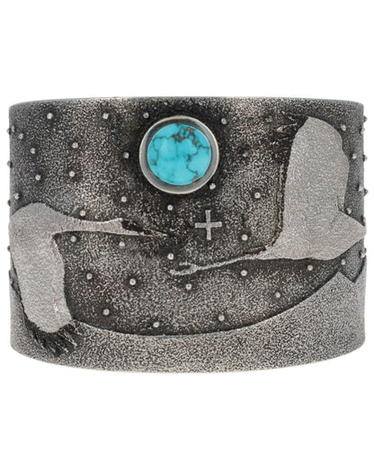 Tufa Stone Cast Sterling Silver Sand Hill Cranes In Night Scene Bracelet Set With A High Grade Natural Lone Mountain Turquoise Round Dome Shaped Stone.  Masterfully Handmade And Designed By Navajo Artist ROBERT W. BEGAY.
