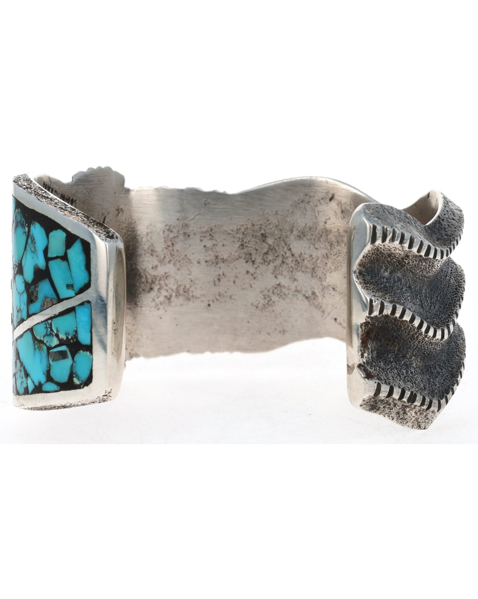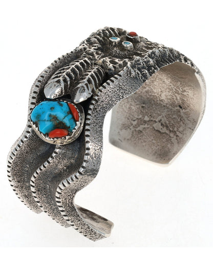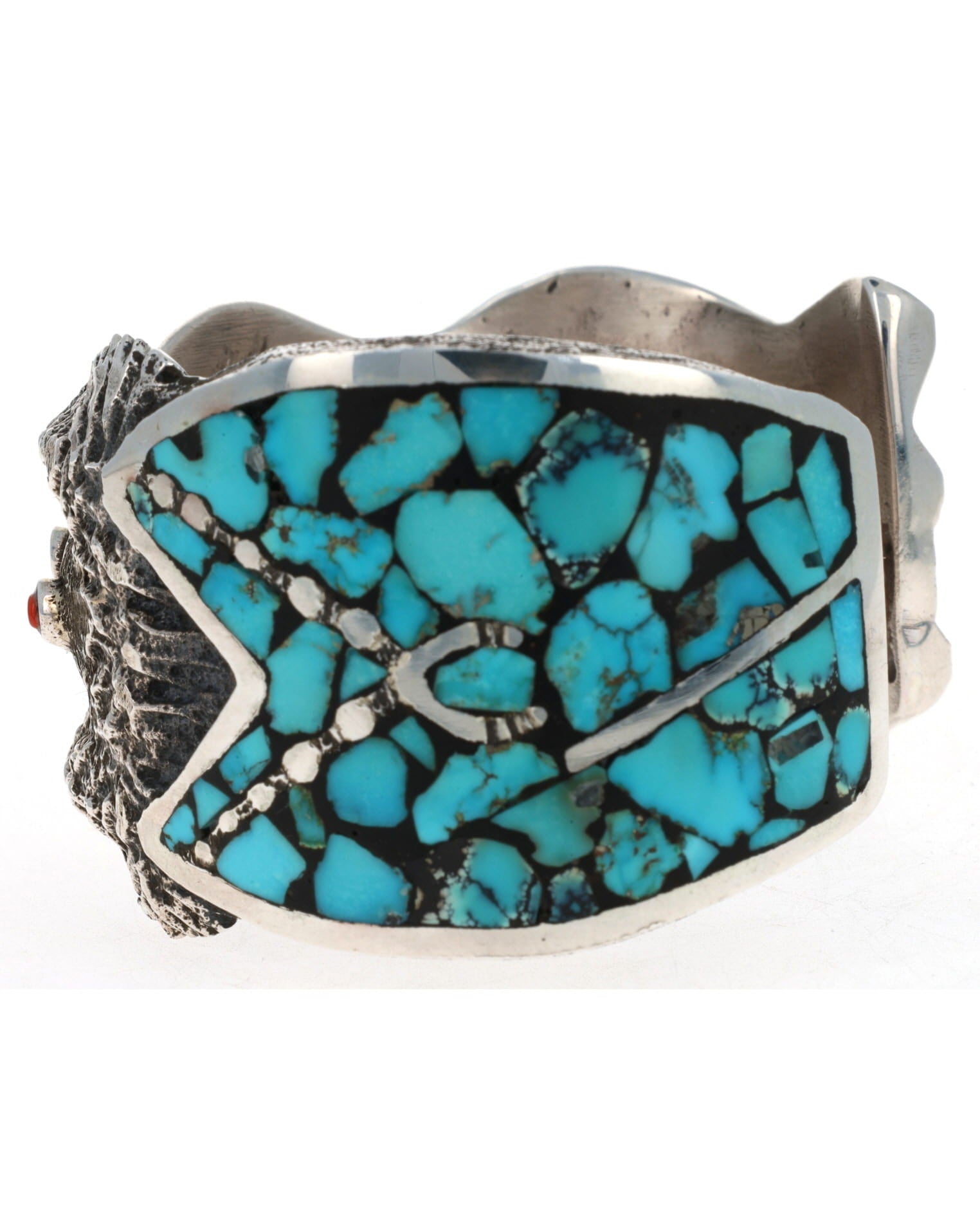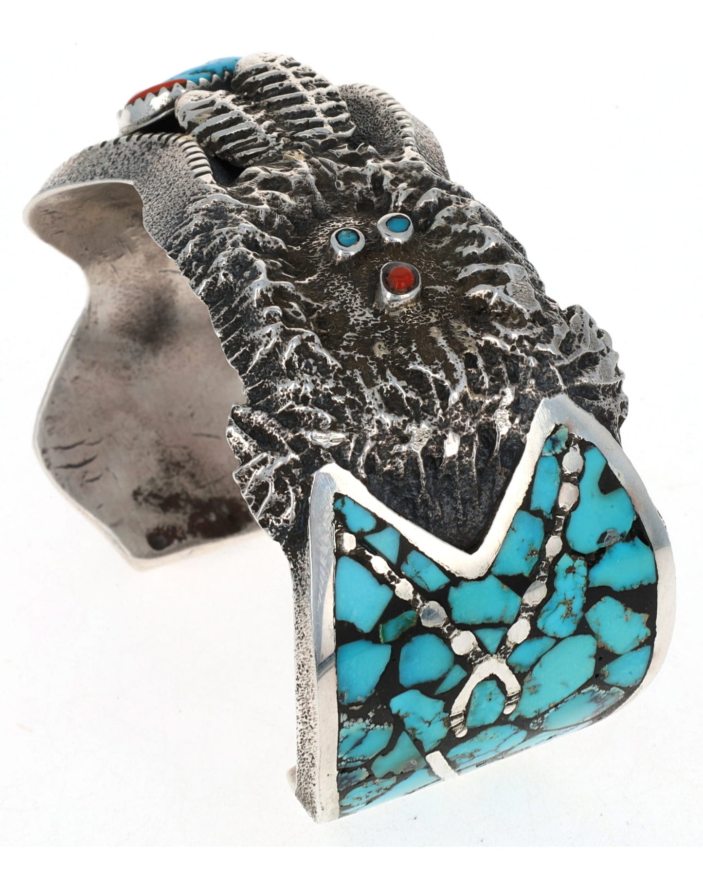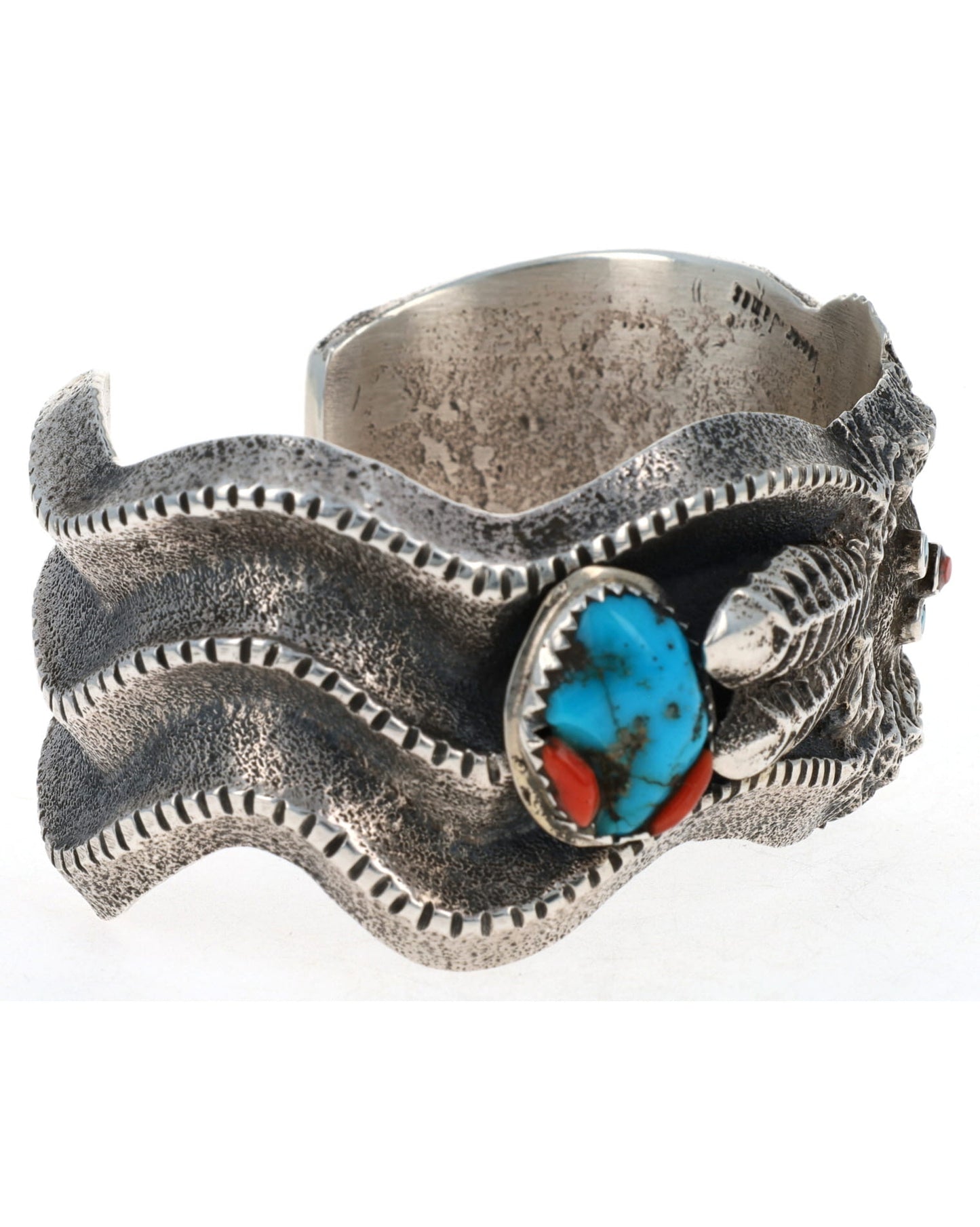 Tufa Stone Cast Heavy Gauge Sterling Silver Yei Bi Chei Bracelet.  Kingman Turquoise Stone Inlay On One Side And Set With Kingman Turquoise And Coral Cabochons On The Opposite Side.  Masterfully Handmade And Designed By Navajo Artist LESTER JAMES.