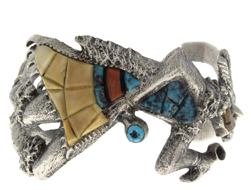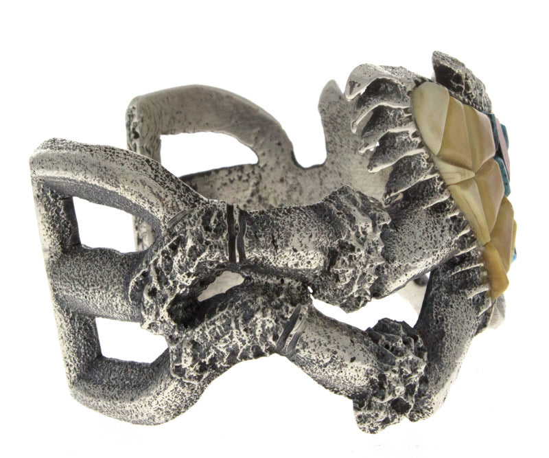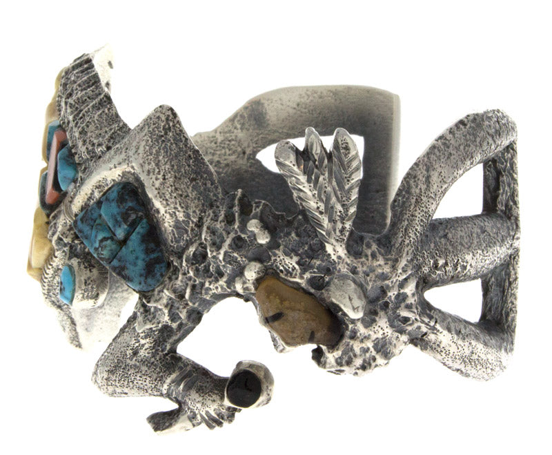 Tufa Stone Cast Sterling Silver  Native American Dancer Bracelet With Multi-Color Raised Cobblestone Inlay Design.  Inlaid Stones Consist Of Kingman Turquoise, Fossilized Ivory, Mediterranean Coral, Jet & Onyx.  Masterfully Handmade And Designed By Navajo Artist LESTER JAMES.