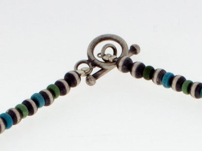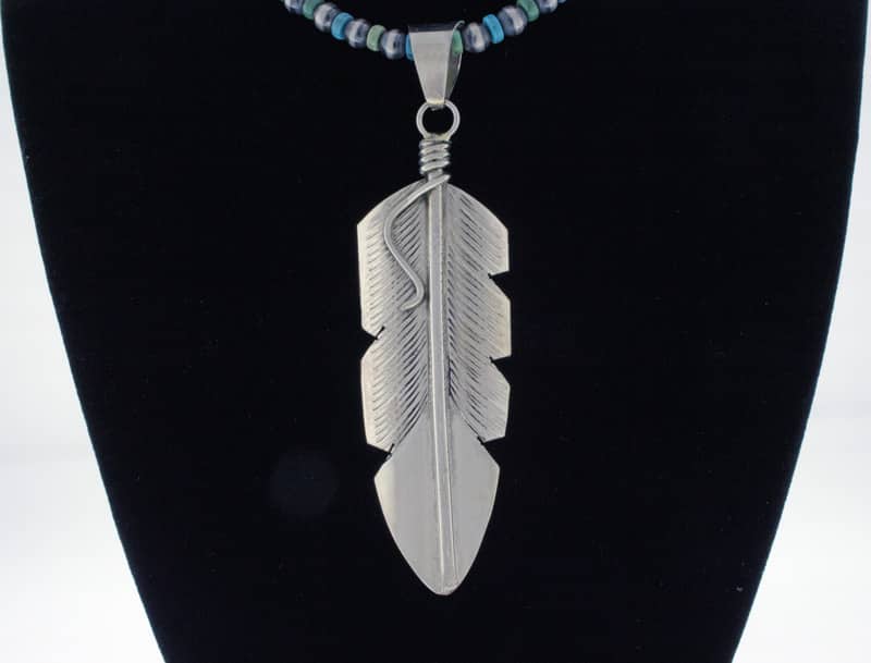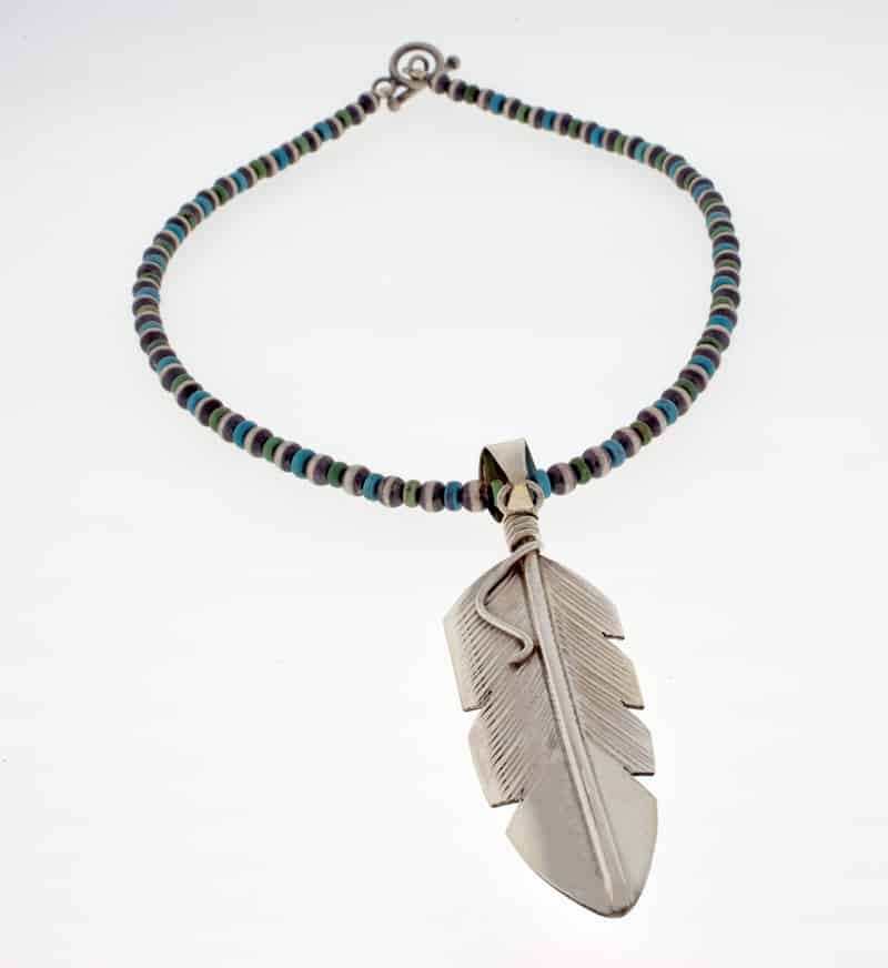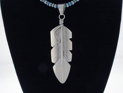 16.5" Length Turquoise & Sterling Silver Bead Necklace With Sterling Silver Feather Pendant.  Pendant Masterfully Handmade And Designed By Navajo Artist CHRIS CHARLEY.